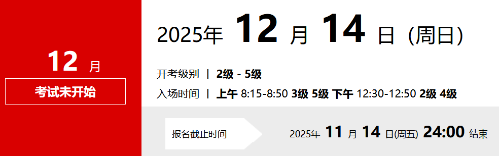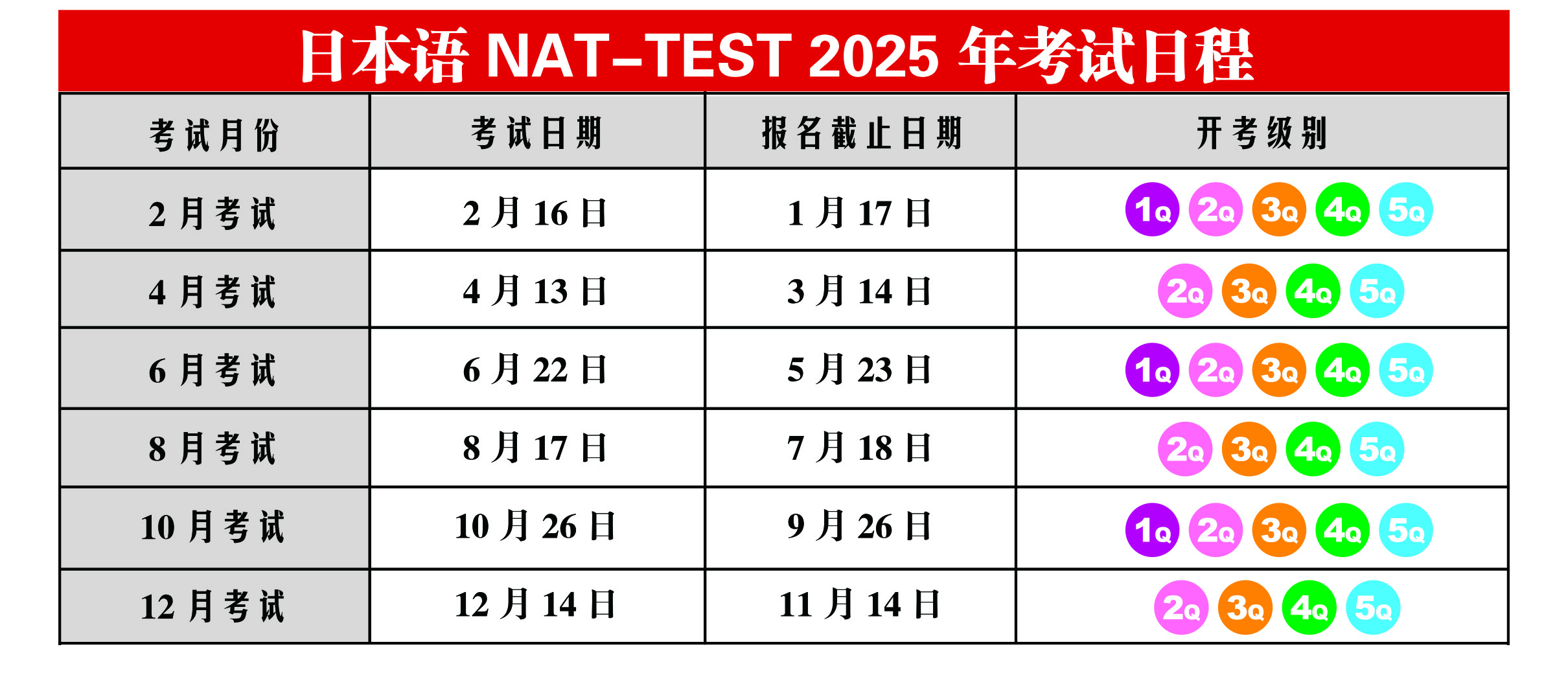 2025年共计举办6场NAT考试,其中最后一场的考试时间是2025年12月14日,报名截止时间是2025年11月14日。考生可登录日本语NAT-TEST官方网站(http://www.nattest-china.com)点击“报名考试”按钮填写个人信息进行考试报名、考场选择、在线支付考试费、下载准考证等。